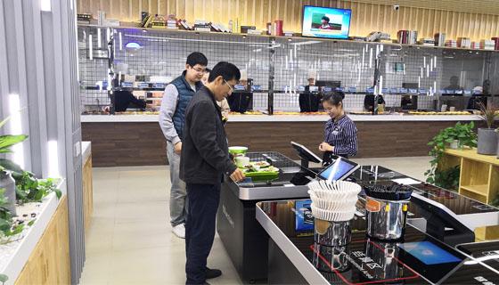 滿客寶智慧食堂在該校美食廣場放置12臺智能結算臺。師生就餐進入菜品自選區(qū),選餐完畢,將餐品放到自動結算臺,結算區(qū)自動識別餐盤底部的芯片,并統(tǒng)計數(shù)量和整單金額,完全自動化結算,無需人工干預。