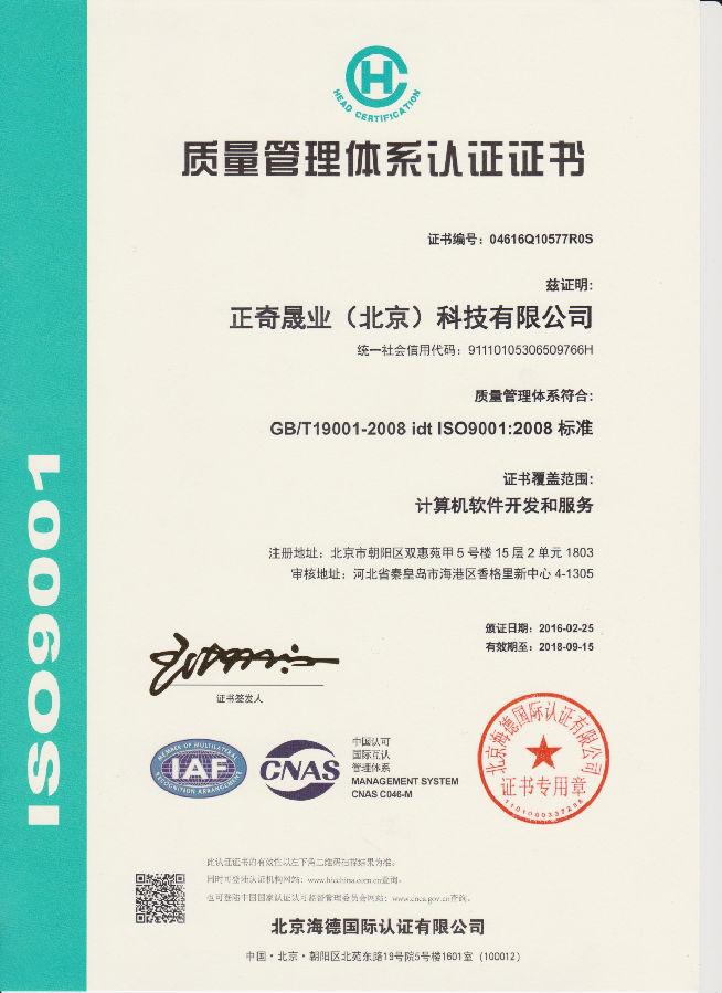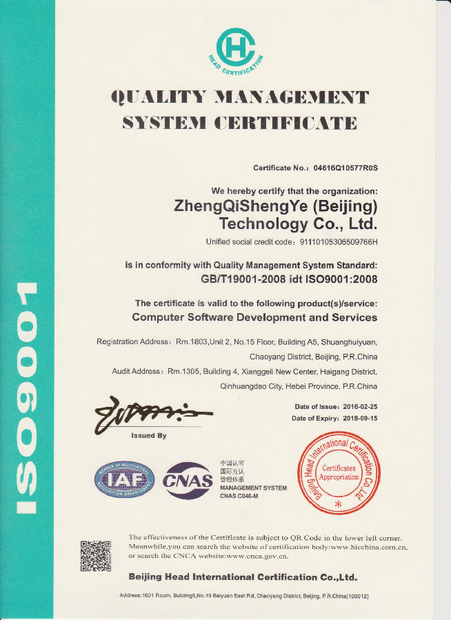 ISO9001:2008質(zhì)量管理體系認證證書的取得,是公司各項管理工作的規(guī)范化、標準化的全面檢測,是對正奇晟業(yè)(北京)科技有限公司持續(xù)穩(wěn)定健康發(fā)展的重要保證。我們將進一步優(yōu)化和規(guī)范各項管理制度,不斷提高體系運行的有效性,不斷提高公司的管理水平,共同推進公司的快速發(fā)展。