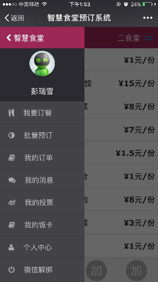 審核驗證:首次進行訂餐時,需要綁定用戶,按提示進行綁定即可,綁定后即可正常使用平臺訂餐功能。)