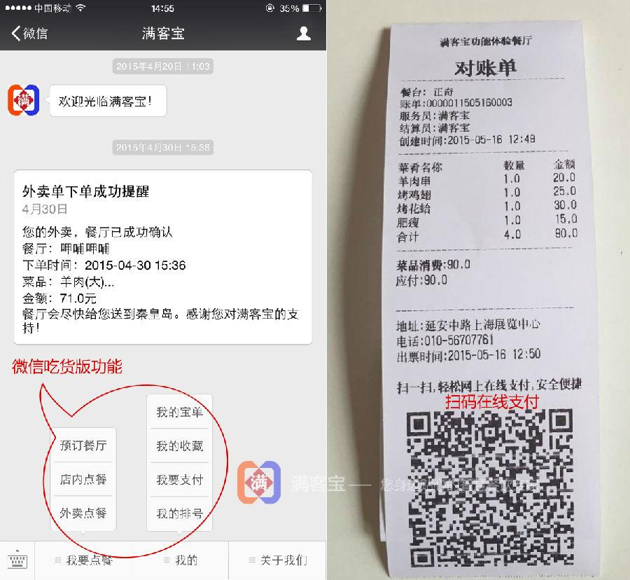 在為顧客提供的個(gè)性化服務(wù)方面,首先滿客寶幫助顧客與餐廳建立起自連接與自管理的新形態(tài),這在以80、90后為主要生產(chǎn)力者的當(dāng)今中國(guó)社會(huì),是非常迎合主流消費(fèi)者心態(tài)和習(xí)慣的。隨著移動(dòng)終端和移動(dòng)APP的普及,餐飲O2O在移動(dòng)端的用戶群體已初具規(guī)模,用戶的適用習(xí)慣也培養(yǎng)起來(lái)。據(jù)中國(guó)餐飲協(xié)會(huì)統(tǒng)計(jì),2015年餐飲O2O在線用戶規(guī)模將超過(guò)2億人。而且經(jīng)過(guò)數(shù)據(jù)調(diào)研發(fā)現(xiàn),餐飲O2O用戶中超過(guò)90%會(huì)通過(guò)手機(jī)下單就餐,可見(jiàn)通過(guò)移動(dòng)終端進(jìn)行餐飲O2O消費(fèi)已經(jīng)深入人心。面對(duì)這數(shù)量日益龐大、觀念前衛(wèi)的吃貨群體,餐飲O2O在移動(dòng)終端服務(wù)方面絕對(duì)大有發(fā)展空間。為給顧客提供個(gè)性精準(zhǔn)的服務(wù),滿客寶特意開(kāi)發(fā)了微信吃貨版,為吃貨提供預(yù)訂餐廳、自助點(diǎn)餐(群點(diǎn))、外賣點(diǎn)餐、排隊(duì)、在線支付等功能,這些功能擺脫了傳統(tǒng)就餐模式的各種限制,很大程度上提高了顧客的就餐體驗(yàn)。