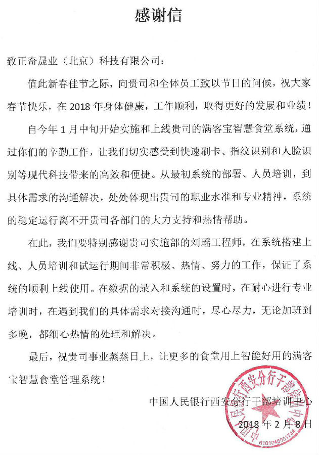 新年伊始,越來(lái)越多項(xiàng)目上線,“滿客寶”好口碑又一次被充分認(rèn)可!中國(guó)人民銀行西安分發(fā)來(lái)感謝信,感謝滿客寶智慧食堂系統(tǒng)工程師劉瑤的認(rèn)真負(fù)責(zé)和踏實(shí)勤奮,同時(shí)肯定了滿客寶智慧食堂項(xiàng)目組各部門(mén)的大力支持和熱情幫助。
