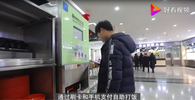 邢鵬輝:現(xiàn)在我們食堂每層樓,使用三臺自動售米飯機,學生根據(jù)飯量大小,選取不同分量米飯機,將餐盤放入出飯口,通過刷卡和手機支付自助打飯,平均2.5秒打完一份米飯。
