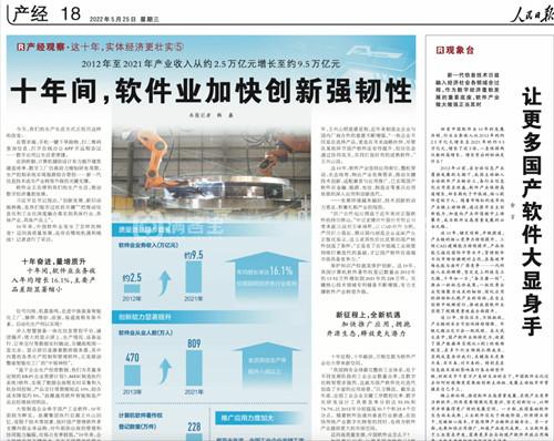 5月25日,人民日報(bào)發(fā)布《十年間,軟件業(yè)加快創(chuàng)新強(qiáng)韌性》和《讓更多國產(chǎn)軟件大顯身手》兩篇文章,以整個(gè)版面回首中國軟件業(yè)近10年的發(fā)展歷程,是錨定創(chuàng)新、升級提速,頂住壓力、不懼挑戰(zhàn)的過程,并提出“作為數(shù)字經(jīng)濟(jì)蓬勃發(fā)展的重要底座,軟件產(chǎn)業(yè)做大做強(qiáng)正當(dāng)其時(shí)”引起廣泛關(guān)注,人民網(wǎng)、澎湃新聞等多家媒體紛紛轉(zhuǎn)載發(fā)布。