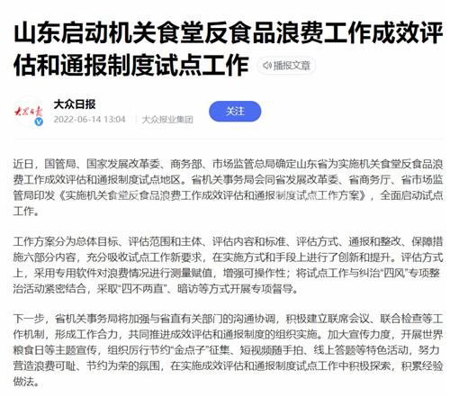 近日,國管局、國家發(fā)展改革委、商務(wù)部、市場監(jiān)管總局確定山東省為實施機關(guān)食堂反食品浪費工作成效評估和通報制度試點地區(qū)。省機關(guān)事務(wù)局會同省發(fā)展改革委、省商務(wù)廳、省市場監(jiān)管局印發(fā)《實施機關(guān)食堂反食品浪費工作成效評估和通報制度試點工作方案》,全面啟動試點工作。
