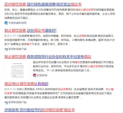 近日,為深入貫徹落實(shí)《中華人民共和國反食品浪費(fèi)法》,營造“崇尚文明消費(fèi)、制止餐飲浪費(fèi)”的濃厚氛圍,多省市各地發(fā)出“制止餐飲浪費(fèi)行為 培養(yǎng)節(jié)約習(xí)慣”的倡議書,對廣大消費(fèi)者及餐飲服務(wù)單位均提出具體要求,共同樹立節(jié)約糧食的新風(fēng)尚。