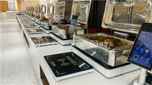 2、托盤放置、按需夾菜:就餐者將餐盤放置在智能秤前的讀盤器上,依次拿取想吃的菜肴,設備自動計算每一次取餐重量,智能顯示屏精準顯示拿取菜肴的重量、價格、營養(yǎng)信息,并對信息進行記錄