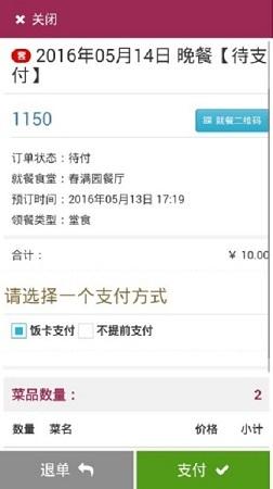 就餐者訂餐后,可以直接進行在線支付操作,直接扣費。也可以選擇“不提前支付”。訂餐后,憑借就餐二維碼到食堂售飯窗口進行掃碼支付操作。樂訂餐在線支付支持微信錢包、支付寶、網(wǎng)銀支付等方式。