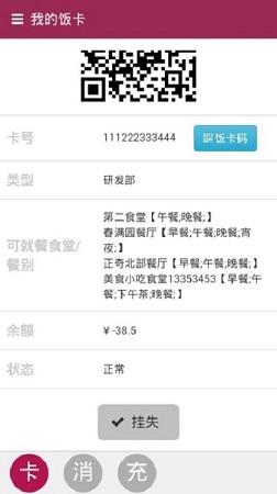 就餐者通過樂訂餐可以查看飯卡使用情況,如:飯卡號碼、飯卡類型、可以就餐的食堂、飯卡余額、飯卡狀態(tài)。通過日期的選擇還可以查看到飯卡消費記錄。如果飯卡丟失,還可以在線申請飯卡掛失。此外,樂訂餐還可以進行飯卡在線充值操作。