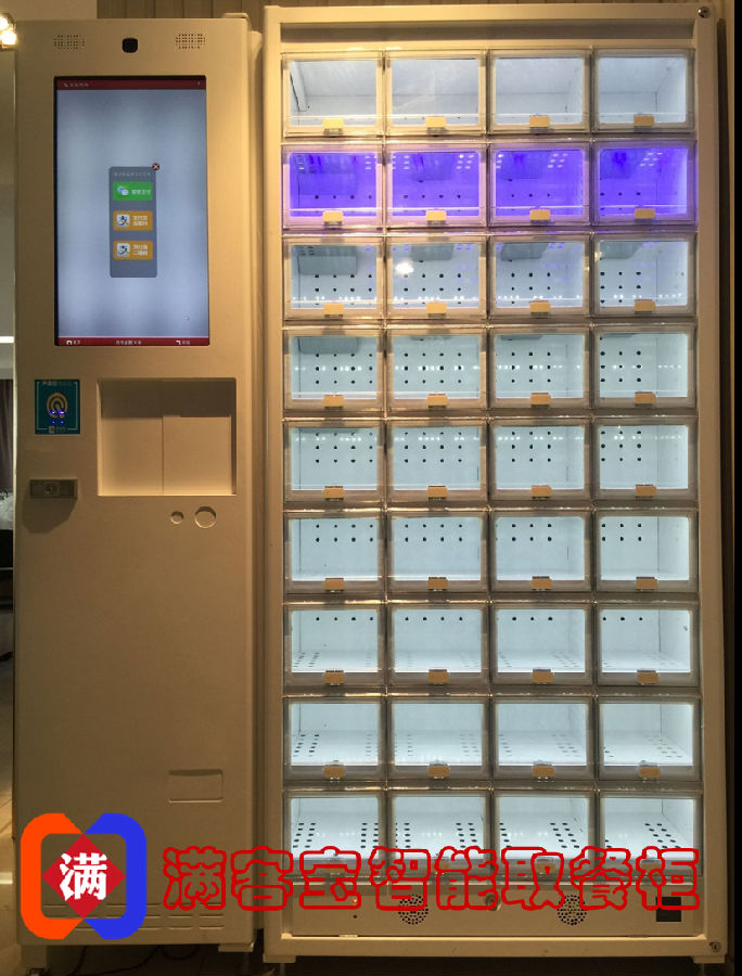 滿客寶智能取餐柜搭載滿客寶智慧食堂軟件系統(tǒng)使用,就餐者使用滿客寶智慧食堂的預(yù)訂功能在手機(jī)APP、微信或網(wǎng)頁上提前點(diǎn)餐、支付,食堂收到訂餐信息后精準(zhǔn)備餐并提前將餐品送至智能取餐柜。滿客寶智能取餐柜外型頗似超市里常見的自助儲物柜,并標(biāo)配21寸高清觸摸屏顯示器,便于就餐者自助取餐并可以實(shí)現(xiàn)在線支付和不間斷視頻宣傳片播放,每臺柜子分為36個小餐柜,具有保溫/保鮮功能,能實(shí)現(xiàn)0-60度的智能溫度控制。在保證食材不變質(zhì)的安全溫度范圍內(nèi)既能保障飯食的溫度,又能保持其鮮味。獨(dú)立的小餐柜將每位用餐者的飯菜分開存放,既安全又衛(wèi)生。滿客寶智能取餐柜通過有線網(wǎng)絡(luò)、無線WIFI、手機(jī)3G/4G與滿客寶智慧食堂后臺系統(tǒng)相連,因此可以將智能取餐柜遍布于各個固定區(qū)域(寫字樓大廳、學(xué)生宿舍、旅游景區(qū)、工廠車間、醫(yī)院大廳、車站等),用餐者可隨時掃碼刷卡取餐,不用在就餐高峰去食堂排隊擁擠就能吃到熱騰騰的飯菜,這對就餐者來說將是遍地都是食堂。另外,滿客寶智能取餐柜融入物聯(lián)網(wǎng)技術(shù),可實(shí)現(xiàn)分布式餐柜的實(shí)時溫度、取餐狀態(tài)、視頻等信息的遠(yuǎn)程監(jiān)控。從而輕松做到及時給未按時取餐用戶的短信或微信友情提示。