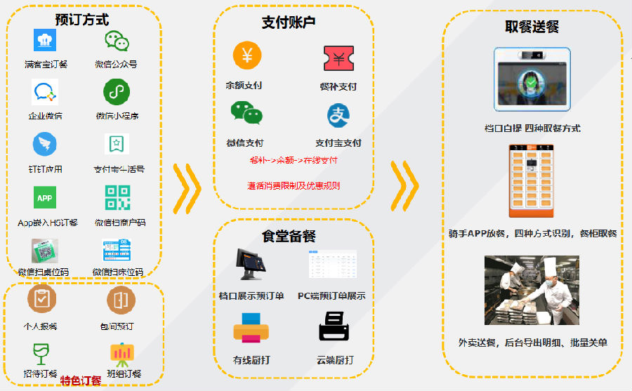滿客寶智慧食堂訂餐系統(tǒng)的15種訂餐方式配合堂食、外賣、餐柜自提、凈菜自提等方式實(shí)現(xiàn)就餐。滿客寶智慧食堂訂餐系統(tǒng)實(shí)現(xiàn)了用餐人員便捷訂餐、取餐,人員零接觸。食堂管理中達(dá)到精準(zhǔn)備餐,降低成本。后勤管理上實(shí)現(xiàn)員工互動(dòng),提升服務(wù)質(zhì)量,提高員工滿意度。