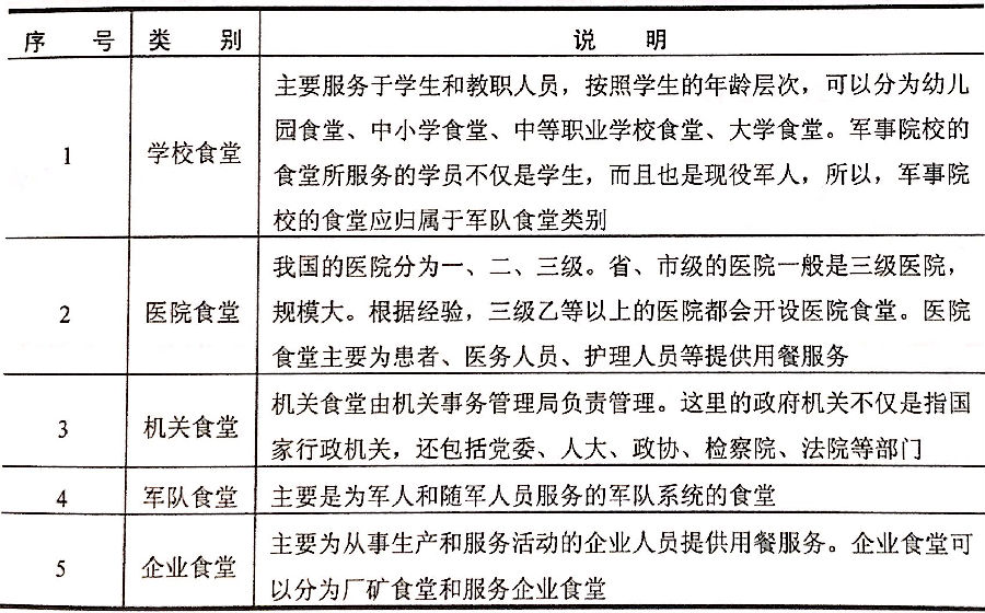 食堂是為單位人員提供日常用餐的場所。按照食堂所服務(wù)的單位所在行業(yè)食堂可以分為表1-1所示的幾種類型。