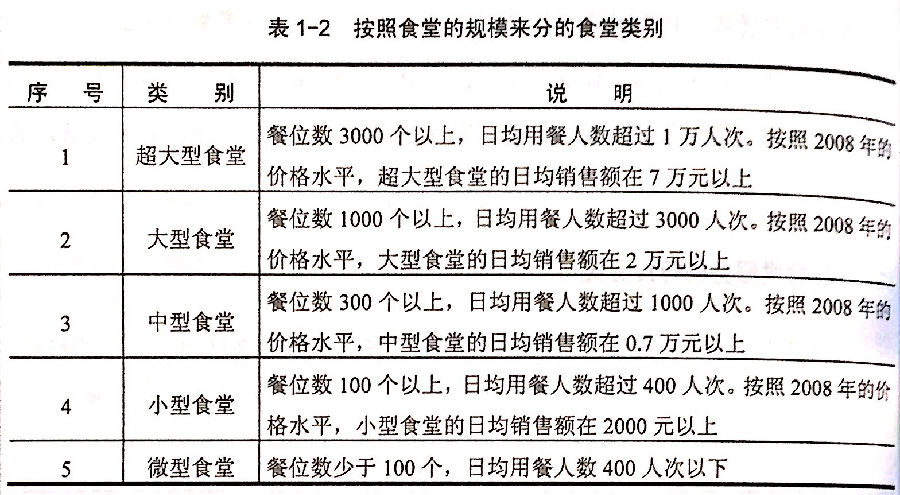 對實(shí)體按規(guī)模來分可以參照3個(gè)指標(biāo):餐位數(shù)、日均用餐人次和日均銷售額,由于銷售價(jià)格存在你地區(qū)差異,前兩項(xiàng)指標(biāo)更具有橫向比較意義。按照食堂的規(guī)模來分的食堂類別見表1-2