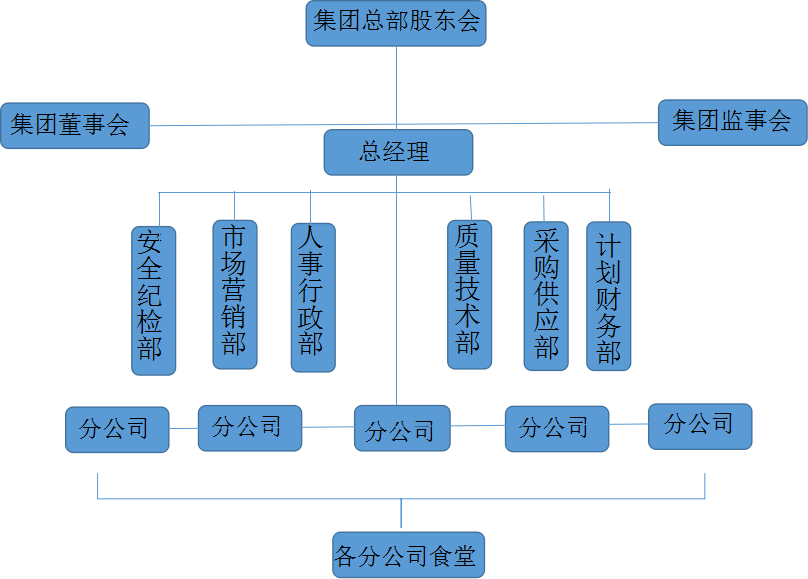 集團(tuán)化經(jīng)營的食堂企業(yè)的組織結(jié)構(gòu)一般也采用直線職能制。集團(tuán)總部對各分(子)公司實(shí)行直接領(lǐng)導(dǎo),同時,設(shè)立了市場營銷部、計劃財務(wù)部、質(zhì)量技術(shù)部、安全紀(jì)檢部、人事行政部、采購供應(yīng)部等職能部門,實(shí)行專業(yè)化的職能管理,并對分(子)公司的對口部門進(jìn)行垂直的業(yè)務(wù)指導(dǎo)。