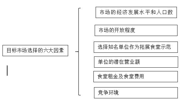 現(xiàn)代食堂的經(jīng)營(yíng)對(duì)象主要為學(xué)校、工廠、醫(yī)院和其他企事業(yè)單位。在過(guò)去,這些單位的食堂都是由單位后勤部門自行經(jīng)營(yíng)。但是食堂經(jīng)營(yíng)與單位所從事的專業(yè)工作往往相差荏遠(yuǎn),導(dǎo)致食堂經(jīng)營(yíng)管理的投入產(chǎn)出不成比例,因此,食堂的外包是社會(huì)分工細(xì)化的必然趨勢(shì),它的市場(chǎng)前景十分廣闊。盡管如此,食堂企業(yè)在選擇目標(biāo)市場(chǎng)時(shí),仍然應(yīng)該小心謹(jǐn)慎,要綜合考慮各方面的因素,如圖2.1所示。
