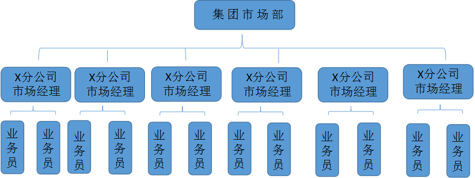 食堂的市場營銷組織是由各分公司市場經(jīng)理直接管理業(yè)務(wù)員。業(yè)務(wù)員在整個營銷過程擔(dān)任了很多職責(zé),也有很大的自主性。調(diào)査目標市場、收集信息時,業(yè)務(wù)員承擔(dān)了市場的工作介紹產(chǎn)品和服務(wù)時,業(yè)務(wù)員承擔(dān)了銷售的職責(zé)與客戶談判、維系客戶關(guān)系時,業(yè)務(wù)員承擔(dān)了公關(guān)的職責(zé)。業(yè)務(wù)員的活動貫穿了市場開發(fā)的整個過程,并可以將自己的業(yè)務(wù)活動情況隨時反映給公司經(jīng)理,乃至集團總部。集團總部也可以追蹤到每一個業(yè)務(wù)員的活動。垂直管理的組織模式(如圖2.3所示)實現(xiàn)了對業(yè)務(wù)員的直接管理,是適應(yīng)食堂營銷的組織模式。