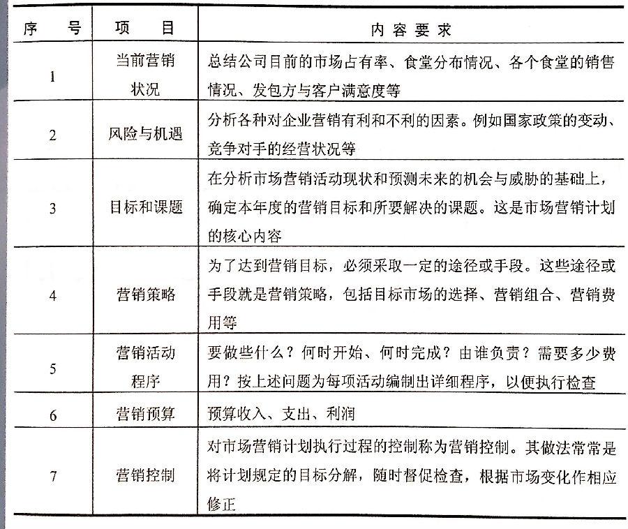 市場營銷計劃包括長期計劃和年度計劃。制訂長期計劃時要重點考慮公司發(fā)展速度、市場占有率、銷售增長率以及目標市場選擇等方向性的問題。年度計劃主要分析當前的營銷環(huán)境,面臨的機遇與挑戰(zhàn),年度內(nèi)的市場營銷策略、促銷。項目、預(yù)算等。內(nèi)容見表2-4.