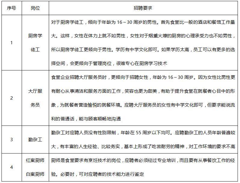食堂企業(yè)的不同崗位在年齡、職業(yè)經(jīng)歷、專業(yè)能力、心理素質(zhì)等方面各有一些具體的要求。以下列舉中快餐飲集團內(nèi)的幾種典型崗位及其招聘要求供參考。
