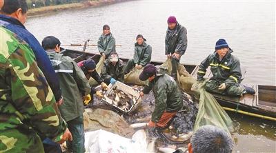 武漢科技大學(xué)聘請的專業(yè)捕撈隊將漁網(wǎng)收到岸邊