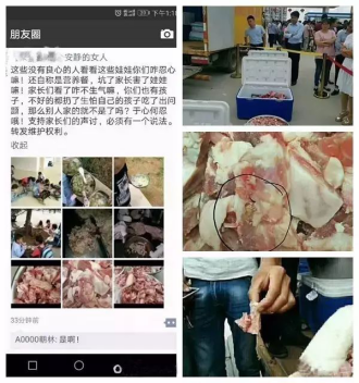 近日,貴州省黔西南州安龍縣部分學(xué)生家長(zhǎng)在校門口攔下某集團(tuán)配送食材車輛,截獲該集團(tuán)為學(xué)校配送的肉類,發(fā)現(xiàn)配送的肉有變質(zhì)、生蛆、發(fā)霉、惡臭等情況。而學(xué)校的孩子們長(zhǎng)期食用配送的肉類,家長(zhǎng)們對(duì)此異常氣憤,隨后將“問題豬肉”在微信朋友圈曝光傳播。