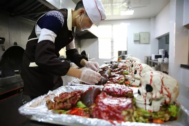 “人體”大餐、“人眼”泡湯、麻辣“人腦”……聽起來是不是驚悚又刺激,真的可以吃哦~,在這些“血淋淋”的食物面前,學(xué)生們真是尖叫不斷,甚至還有臨陣脫逃的。師傅,你認真做菜的樣子,好可怕啊。