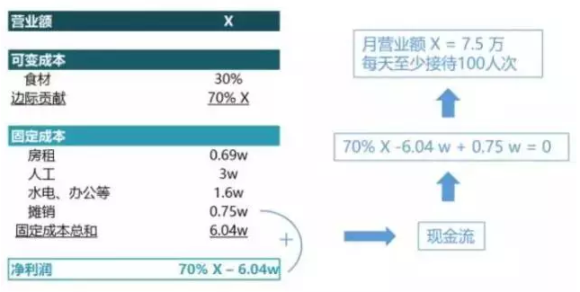 假設(shè)這家店的客單價(jià)是25元,那么每天餐廳需至少接待(75000/25)/30 = 100個(gè)人才可維持餐廳的正常運(yùn)營(yíng)。