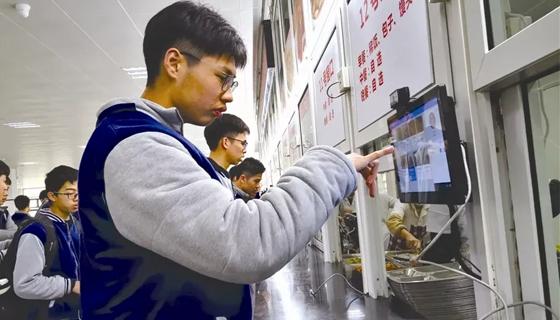 中午12點,是學生用餐時間,中學食堂供應盒飯、蓋澆飯、披薩、面食等,不同年級的學生分開用餐。每層樓的食堂有十幾個窗口,窗口前都放置了刷臉點餐屏幕,上面對應著飯菜的圖片、名稱與價格。學生們排著整齊的隊伍打菜,排到的學生在屏幕前一站,人臉掃描后屏幕會顯示學生的姓名、照片,學生在屏幕上選擇心儀的飯菜點擊,就會顯示所點飯菜的價格。這時食堂的工作人員已經(jīng)把配好的飯菜遞了過來,整個過程快速而便捷
