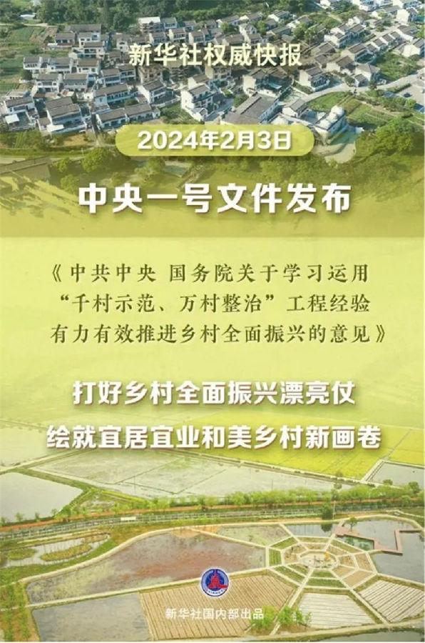 2024年中央一號文件3日發(fā)布《中共中央國務(wù)院關(guān)于學(xué)習(xí)運(yùn)用“千村示范、萬村整治”工程經(jīng)驗(yàn)有力有效推進(jìn)鄉(xiāng)村全面振興的意見》。這是黨的十八大以來第12個指導(dǎo)“三農(nóng)”工作的中央一號文件。
