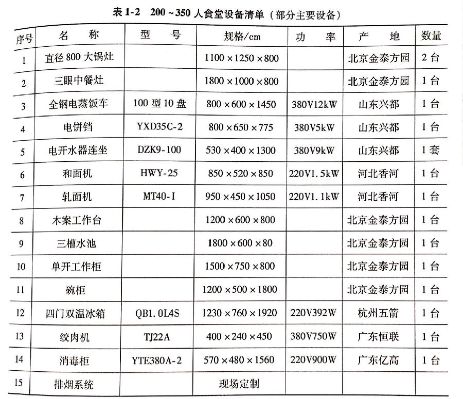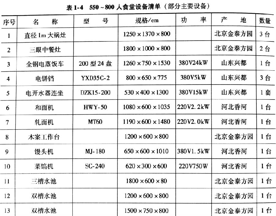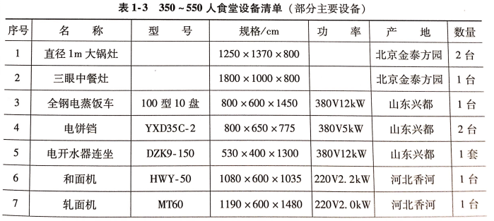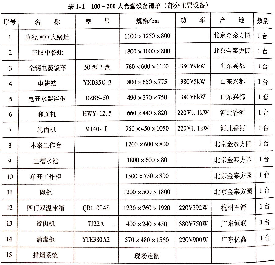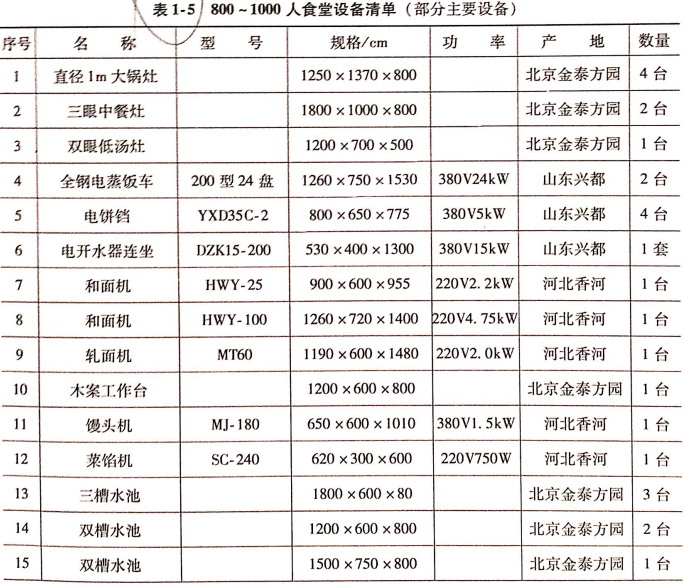 食堂設(shè)備購(gòu)置首先應(yīng)該考慮就餐人數(shù)及場(chǎng)地和食品處理區(qū)場(chǎng)地面積等。必要的炊事機(jī)械和廚房設(shè)備是搞好食堂伙食的必備條件之一。通過(guò)炊事機(jī)械和廚房設(shè)備的加工制作,能夠更好的提現(xiàn)食品的營(yíng)養(yǎng)、價(jià)值和感官。食堂對(duì)炊事機(jī)械和廚房設(shè)備的有效利用,還能降低食堂炊事人員的勞動(dòng)強(qiáng)度,提高工作效率,保證伙食質(zhì)量。因此,配置必要的炊事機(jī)械和廚房設(shè)備是食堂開辦的重要組成部分。當(dāng)然,也要根據(jù)實(shí)際需要、按照客觀需求,不可盲目鉤子,避免不必要的浪費(fèi)和損失。表1-1~表1-5提供了不同規(guī)模食堂的設(shè)備清單。