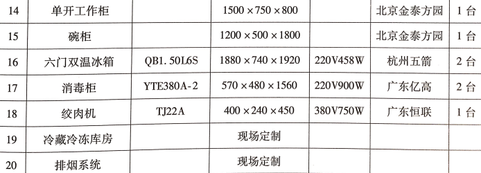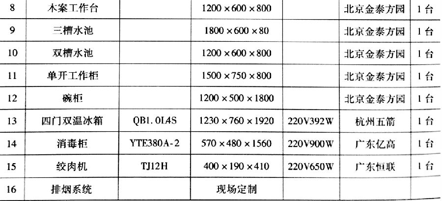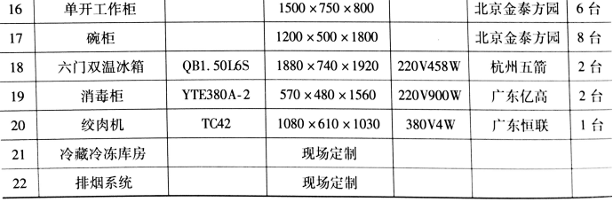注:帶冷葷涼菜的嚇你過(guò)目的需要按冷葷間規(guī)定達(dá)到專人、專室、專工具、專消毒、專冷藏等配置。具體應(yīng)為冰箱一臺(tái),專用洗手池一個(gè),清洗、消毒、沖洗水池各一個(gè),專用工作臺(tái)等。同時(shí),應(yīng)具備二次更衣條件。其他餐、廚用具用戶可根據(jù)需要自行配置。