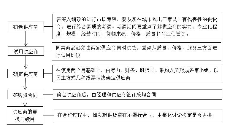 為對食堂的采購與供應(yīng)進行有效控制,滿客寶認(rèn)為有必要事先進行規(guī)劃,也就是對采購工作計劃的制訂、采購人員的配置、采購方式、供應(yīng)商、價格方面、數(shù)量方面、驗收方面都制定一個總的規(guī)則,使具體負(fù)責(zé)的人員有章可循。