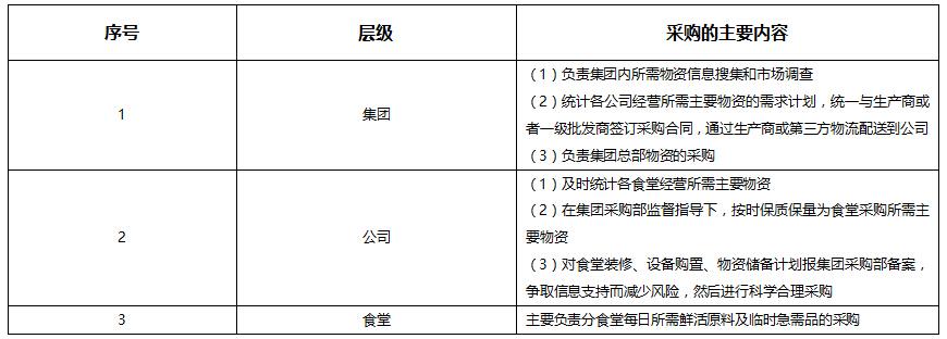 司、食堂的三理體系,那么,采購(gòu)與供應(yīng)管理就自然而然地要分集團(tuán)、公司、食堂三個(gè)層級(jí)的對(duì)應(yīng)內(nèi)容,各層級(jí)的具體采購(gòu)和供應(yīng)內(nèi)容見下表。