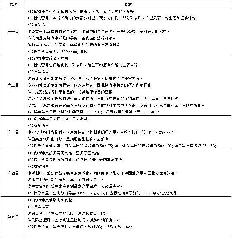 編制食譜,首先要了解膳食配餐的要求。中國(guó)居民平衡膳食標(biāo)準(zhǔn)是根據(jù)《中國(guó)居民膳食指南》而設(shè)計(jì)的,用于指導(dǎo)一般大眾飲食,達(dá)到健康目的。膳食配餐包括以下幾個(gè)層次(自下而上),見表