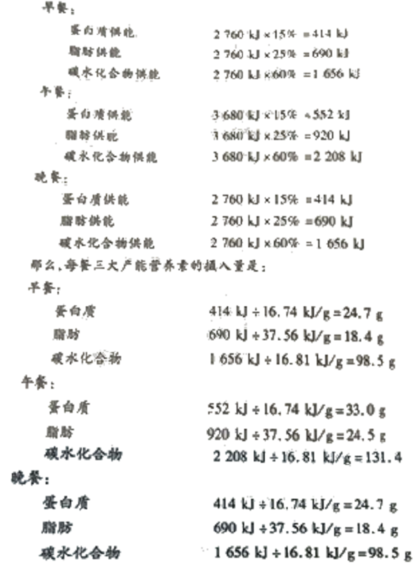三大產(chǎn)能營養(yǎng)素的供能比分別是:蛋白質(zhì)占10%~15%,脂肪占20%~30%,碳水化合物占55%~65%,通常取中等值計算,蛋白質(zhì)占15%,脂肪占25%,碳水化合物占60%。