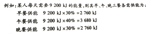 (2)確定用餐者每餐能量需要量。當(dāng)確定了用餐者全天的能量需要量后,就可以根據(jù)三餐的能量分配比例計算出每餐的能量需要量。一般三餐的適宜分配比例為:早餐占30%,午餐占40%,晚餐占30%,可將全天的能量需要按此比例進行分配。