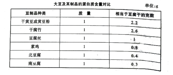(2)大豆及其制品。《中華人民共和國衛(wèi)生行業(yè)標(biāo)準(zhǔn)—學(xué)生營養(yǎng)午餐營養(yǎng)供給量》標(biāo)準(zhǔn)中所規(guī)定豆制品的數(shù)量是以豆腐干為1,其他豆制品則可依其蛋白質(zhì)含量進(jìn)行折合,其比例見下表。