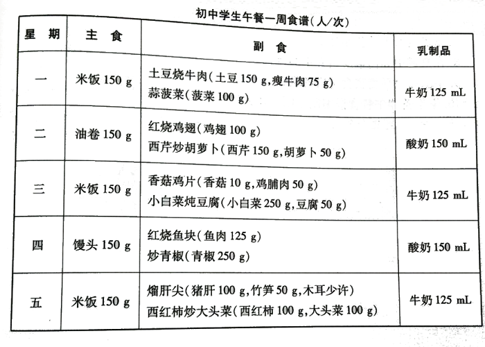 1998年,我過頒布了《中華人民共和國衛(wèi)生行業(yè)標(biāo)準(zhǔn)—學(xué)生營養(yǎng)午餐營養(yǎng)供給量》的行業(yè)標(biāo)準(zhǔn)。此標(biāo)準(zhǔn)中規(guī)定:學(xué)生營養(yǎng)午餐就是在上學(xué)日,由學(xué)校食堂或飲食供應(yīng)中心等為在校學(xué)生提供的符合營養(yǎng)要求的午餐。以一周五天為單位的日平均食物攝入量,午餐各類營養(yǎng)素的攝入量應(yīng)占《推薦的每日膳食營養(yǎng)素供給量標(biāo)準(zhǔn)》的40%。