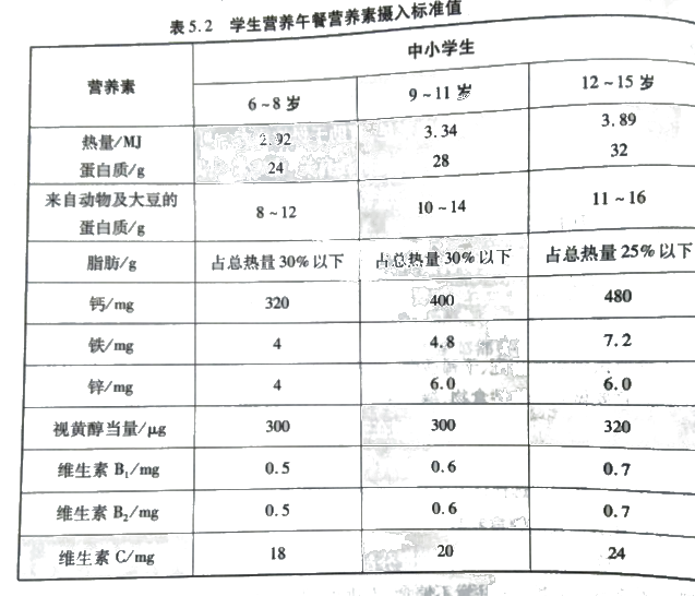 (一)學(xué)生營養(yǎng)午餐營養(yǎng)素供給量