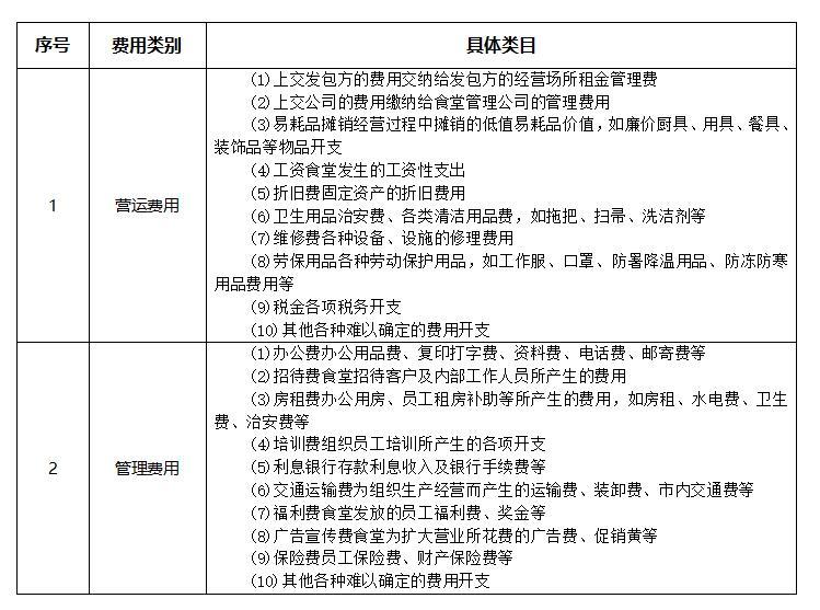 期間費(fèi)用包括兩大類:營(yíng)運(yùn)費(fèi)用和管理費(fèi)用,營(yíng)運(yùn)費(fèi)用是食堂經(jīng)營(yíng)部門在經(jīng)營(yíng)過(guò)程中發(fā)生的各項(xiàng)費(fèi)用;管理費(fèi)用是食堂的生產(chǎn)服務(wù)部門為組織和管理生產(chǎn)經(jīng)營(yíng)活動(dòng)而發(fā)生的各項(xiàng)費(fèi)用,如下表。