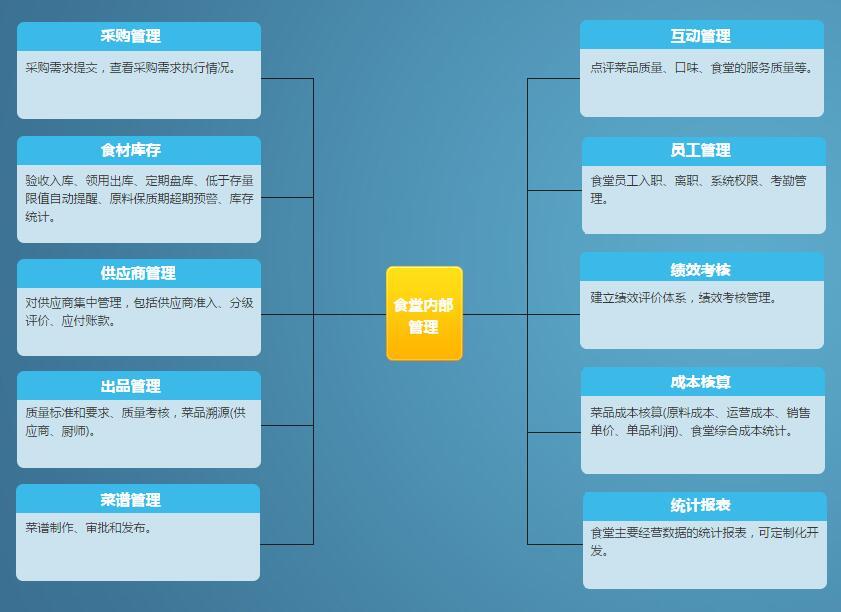 高校智慧食堂管理軟件采取規(guī)范化、流程化、精細(xì)化、標(biāo)準(zhǔn)化管理,從預(yù)訂備餐管理到出品管理到成本核算到采購管理到供應(yīng)商管控到庫存管理等形成一個閉環(huán)的管理流程,牽一發(fā)而動全身,各部門之間形成了有效的業(yè)務(wù)上下游部門或者崗位之間的監(jiān)督制約機(jī)制。所有信息實時被管理者掌控,有效地解決采購部門個人利益大于企業(yè)利益。