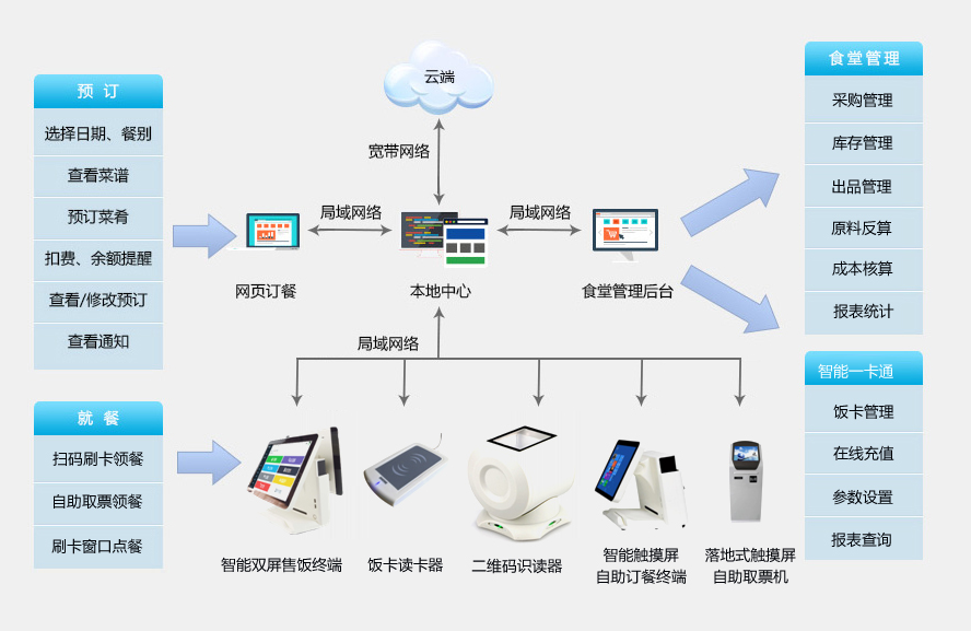 系統(tǒng)除了服務(wù)就餐者之外還可增加食堂后臺管理,滿客寶智慧食堂管理系統(tǒng)幫助食堂按照信息化要求進行管理變革,在食堂運營信息化基礎(chǔ)上,同步實現(xiàn)管理效能化、作業(yè)標(biāo)準(zhǔn)化、管理效能化和經(jīng)營效益化。通過網(wǎng)絡(luò)在線流轉(zhuǎn),并且數(shù)據(jù)無縫銜接,無紙化快捷傳送。實現(xiàn)了工作效率高,差錯率低,勞動強度小,智能化程度高等現(xiàn)代食堂科學(xué)管理的要求。信息系統(tǒng)能動態(tài)實時呈現(xiàn)各級各類指標(biāo)的變化情況,管理層能實時發(fā)現(xiàn)問題,開展精細(xì)化、實時的監(jiān)管和指揮調(diào)度。