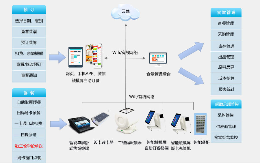 高校食堂管理軟件--滿客寶智慧食堂支持多食堂、多倉庫、多崗位的網(wǎng)上協(xié)同作業(yè)的管控,包括:卡務(wù)管理,如飯卡充值、核銷、掛失、餐補管理等;菜譜管理,菜肴維護、常用菜譜、菜譜發(fā)布等;預(yù)訂管理,訂餐信息、餐補、原料反算;庫存管理,如收貨、入庫、出庫、退料、調(diào)撥、退貨、盤存、庫存查詢等;財務(wù)管理,如收入登記、支出登記、科目維護、入庫價格等;采購管理,如料單自動收集匯總,向供應(yīng)商下單,供應(yīng)商及其供貨品種維護,供應(yīng)商日對賬、采購定價、比價等;財務(wù)管理,如收入登記、支出登記、科目維護、入庫價格等;決策分析,如收發(fā)存報表、收支成本毛利核算報表、營業(yè)日周月年統(tǒng)計等。一系列運營數(shù)據(jù)實時被管理者掌控,只要有網(wǎng)絡(luò),不受地點的影響,對及時科學決策奠定基礎(chǔ),有效避免時效性、方向性錯誤造成的食堂成本浪費。