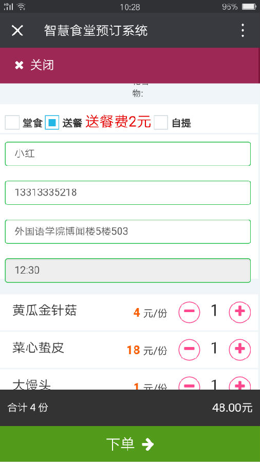 學生可以在食堂微信平臺相應的時間段內選擇自己所喜歡的飯菜進行訂餐,可以選擇自提或者派送功能。與此同時,食堂可以根據(jù)當前的訂餐信息統(tǒng)計進行備餐,備好餐后把餐品放入智能取餐柜,餐柜可以擺放在固定區(qū)域。餐柜具有保溫/保鮮功能。在保證食材不變質的安全溫度范圍內既能保障飯食的溫度,又能保持其口味。獨立的小餐柜將每位用餐者的飯菜分開存放,既安全又衛(wèi)生。使用高校食堂管理系統(tǒng)不僅能訂餐還能指定時間送,比以前節(jié)省了不少時間,為學生提供了便利。微信訂餐既符合學生們的需求又與時俱進,也給經(jīng)常宅在宿舍的同學開啟了一大福利。外賣功能可以在高校食堂管理系統(tǒng)后臺設置開啟或者關閉,如果食堂關閉,懶到不出門的宅男宅女,只能靠舍友拯救啦。