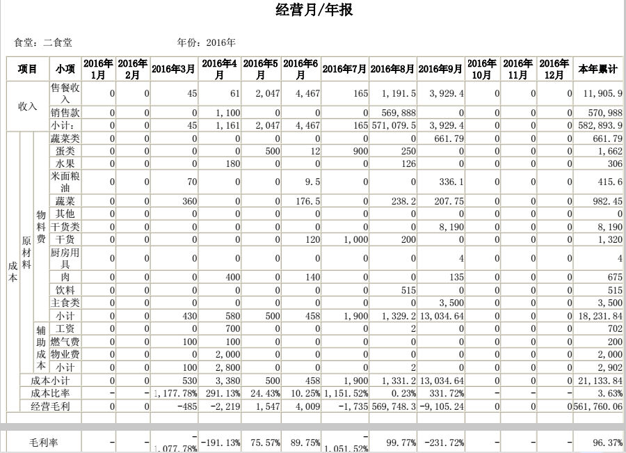 6、該報表是食堂一年內(nèi)的經(jīng)營報表,可以查看每個月內(nèi)食堂原材料消耗成本、毛利等信息,輔助食堂進(jìn)行決策和管理。