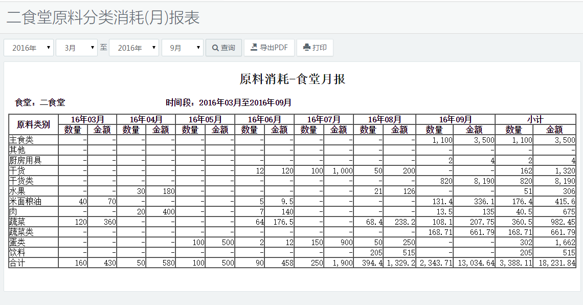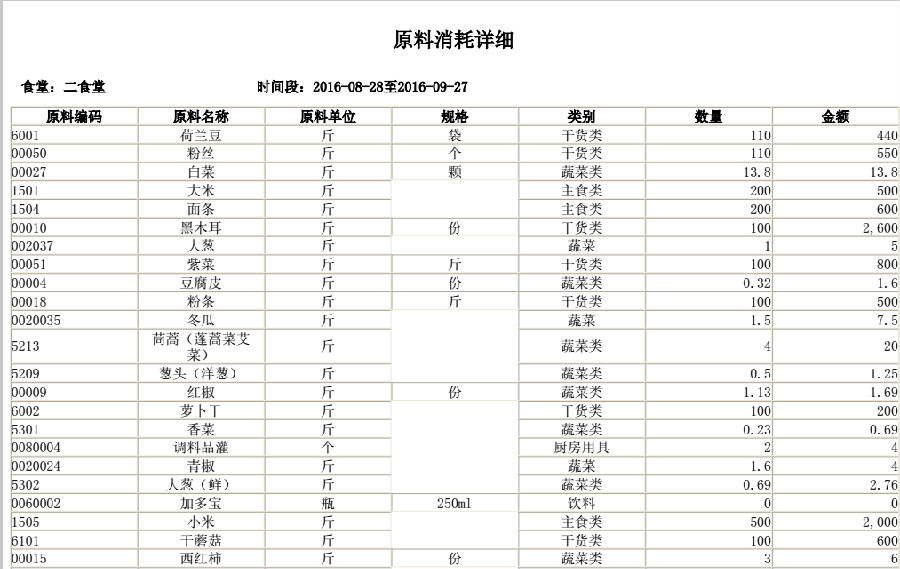 2、該報表是食堂原材料消耗的食堂月報表,用來分類統(tǒng)計每個月食堂庫存統(tǒng)計。