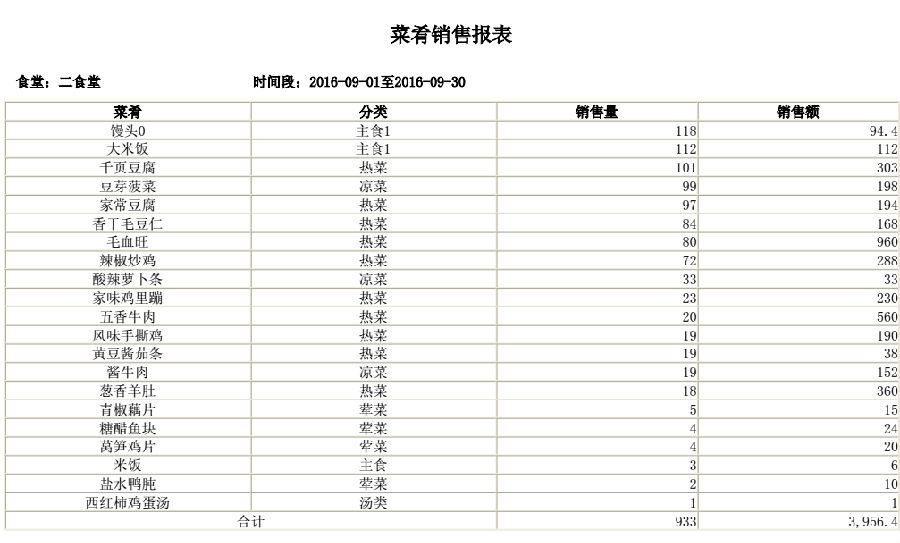 4、該報表是食堂菜肴銷售報表,可以查詢某天或某時段內(nèi)食堂的菜肴銷售情況以及銷售額。