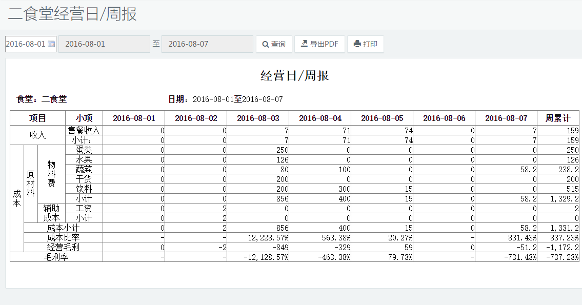 5、該報表是食堂一周的經(jīng)營報表,可以查看一周內(nèi)食堂原材料消耗成本、毛利等信息。