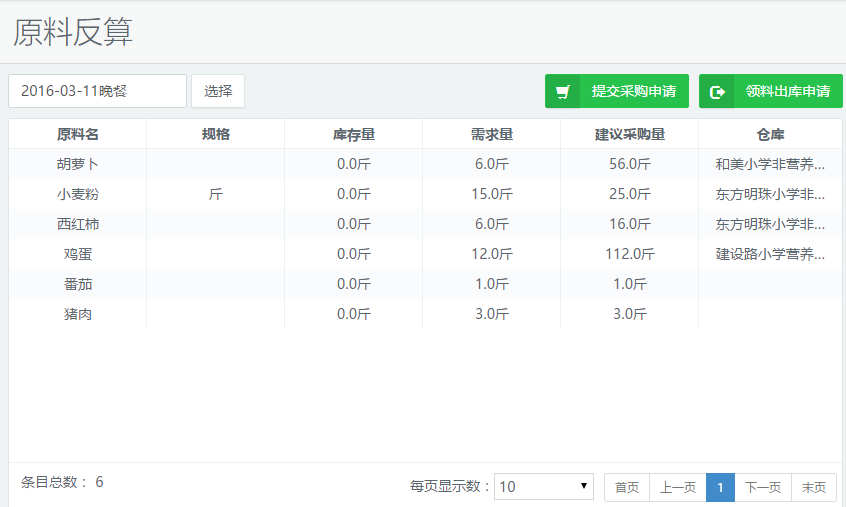 通過生成計(jì)劃,自動生成原料反算,內(nèi)容包括:生產(chǎn)計(jì)劃需求量,庫存余量,建議采購量,并可自動生成原料出庫單或者原料采購申請,與訂餐數(shù)據(jù)形成管理閉環(huán);