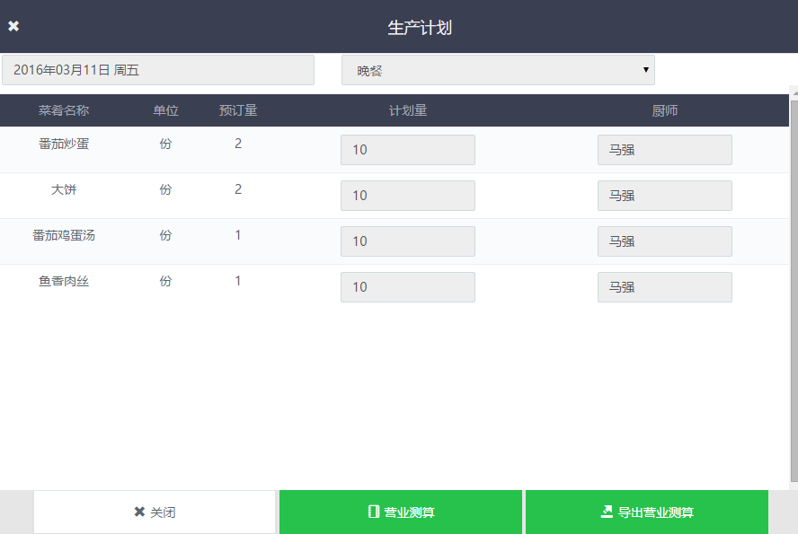 通過備餐數(shù)據(jù)生成生產(chǎn)計(jì)劃,生產(chǎn)計(jì)劃包括:預(yù)訂量,計(jì)劃生產(chǎn)量,制作廚師等內(nèi)容;