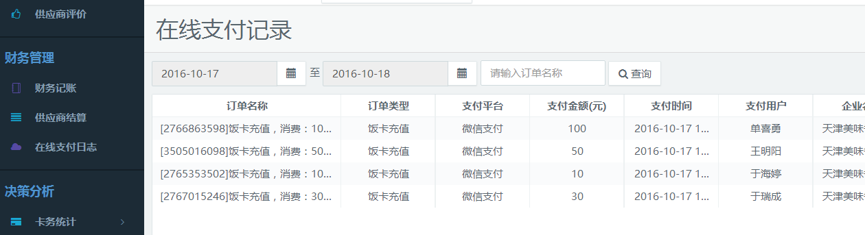 在線支付日志幫助財務(wù)管理人員統(tǒng)計飯卡在線充值的金額、充值方式、充值日期、支付用戶等信息,詳細(xì)記錄每筆交易。