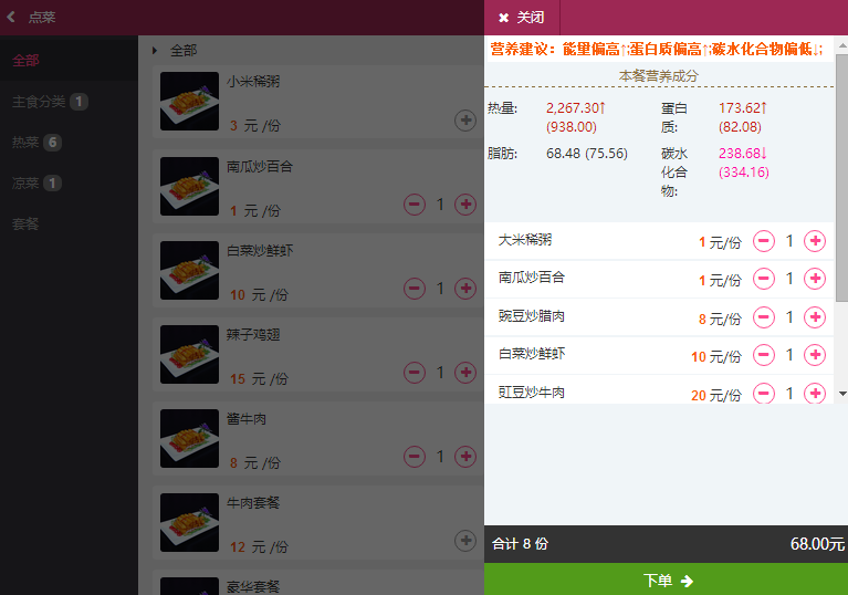 滿客寶智慧食堂是現(xiàn)代食堂管理軟件中的領(lǐng)航者,其智能營養(yǎng)餐功能比較全面。軟件提供全面的原料營養(yǎng)信息庫,并自動對原料營養(yǎng)進行科學(xué)的計算后,針對不同類型的營養(yǎng)訴求進行合理的搭配,供用餐人選擇。系統(tǒng)可根據(jù)用餐人的身高、體重、年齡、營養(yǎng)訴求等基本信息自動匹配營養(yǎng)套餐,并且針對醫(yī)院病患,系統(tǒng)可以設(shè)置特殊病情人員,系統(tǒng)后臺設(shè)置好相應(yīng)的不可以進餐的菜品,為就餐者提供智能營養(yǎng)餐服務(wù)。